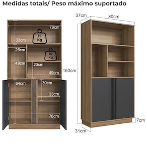 Peso máximo suportado: mesa: 40Kg (tampos 20kg e gavetas 5 cada) e armário: 55Kg (nicho superior 15Kg, nichos inferiores 10kg cada e prateleira 10kg)
