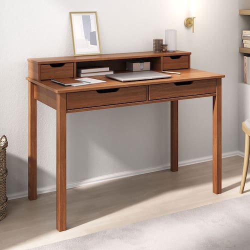 Com um tampo amplo e quatro gavetas, a Mesa de Estudos para Quarto Raul em Madeira Maciça é perfeita para otimizar espaços. As gavetas superiores possuem corrediças de madeira, enquanto as gavetas inferiores contam com corrediças telescópicas, garantindo deslizamento suave e maior praticidade no uso diário. Todas as gavetas possuem puxadores em cava, conferindo um visual limpo e contemporâneo.
