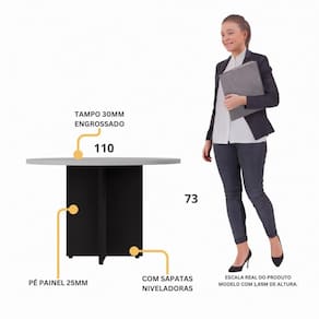 Diferenciais: - Produzida em MDP de reflorestamento: durável e ecologicamente correta. - Acabamento em BP: superfície sofisticada e fácil de limpar. - Tampo redondo de 30mm: resistente, suporta até 25kg com estabilidade e segurança. - Pés robustos de painéis de 25mm: garantem firmeza e um visual moderno. - Sapatas niveladoras: mantêm a mesa estável. - Design versátil: combina facilmente com diferentes estilos de decoração e mobiliários corporativos.