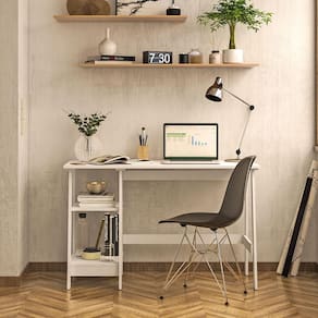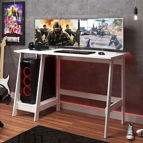 Excelente opção de mesa com 2 prateleiras que podem ser montadas em ambos os lados: direito/esquerdo. Quer tornar essa mesa em gamer? Fácil. Se você precisar de espaço para uma grande CPU de computador, é só remover a prateleira intermediária para obter mais espaço.
