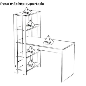 Peso máximo suportado: 26 kg (tampo 10 kg / prateleiras 4 kg cada)