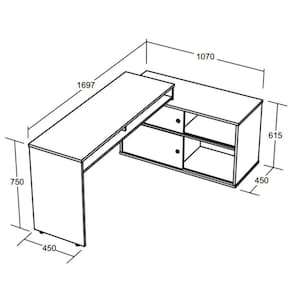 Características da Mesa Escrivaninha 2 Portas de Correr em L Alex: - Tamponamento em MDP 18 mm de espessura com fita de borda ABS 1 mm de espessura; - Estrutura em MDP 15 mm de espessura com fita de borda ABS 0,45 mm de espessura; - 2 Portas de correr com kit roldana e perfis em metal; - Puxadores plásticos embutidos nas portas; - 12 Opções de posição da mesa que podem ser escolhidas durante a montagem; - Sapatas plásticas com regulagem de altura; - Traseira em MDF 6 mm revestida dos dois lados; - Não acompanha objetos decorativos; - Montagem por conta do comprador;