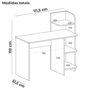 Mesa escrivaninha projetada para otimizar o uso do espaço com eficiência. Estrutura em MDF/MDP 15 mm que suporta até 21 kg, amplo tampo, 3 prateleiras laterais com cantos arredondados e sapatas plásticas. Acabamento em pintura UV texturizada (fosca e acetinada), também aplicado no verso do móvel. Este móvel chegará em sua casa separado em 01 volume.
