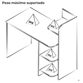 Peso máximo suportado: 21 kg (tampo 5 kg e prateleiras 2 kg cada)