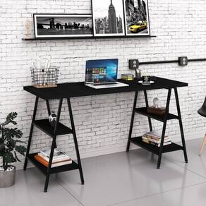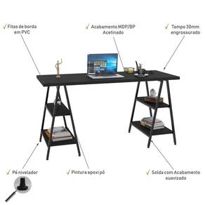 Pensando nisso, a Mpozenato desenvolveu a Mesa Cavalete Prisma para trazer inovação e funcionalidade ao seu dia a dia de trabalho e estudos. Essa mesa de escritório conta com uma estrutura metálica slim, sendo os pés cavaletes confeccionados em Aço, com soldas suavizadas e pintura epóxi na cor Preta, além dos niveladores de altura. Já o tampo engrossurado de 30mm e as prateleiras na cor Preto Ônix são fabricados em MDP com acabamento BP acetinado, proporcionando maior durabilidade e resistência ao produto.