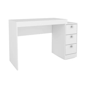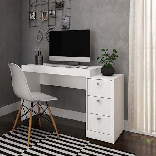 A Mesa Escrivaninha com gaveteiro lateral de três gavetas é a escolha ideal para quem precisa de um espaço funcional e organizado para trabalhar ou estudar. Com amplo tampo para acomodar computadores, livros e materiais, oferece praticidade aliada a um design moderno. O gaveteiro lateral proporciona armazenamento extra, mantendo documentos e objetos pessoais sempre ao alcance, ajudando a manter a área de trabalho limpa e eficiente. Fabricada em MDP resistente, é perfeita para escritórios, home office ou quartos, unindo durabilidade, estilo e funcionalidade. CARACTERÍSTICAS TÉCNICAS: - Estrutura em MDP de 15 mm - Acabamento Fosco cor Branco - Gavetas com Roldanas - Puxadores tipo Ponto em Plástico - Suporta até 15 kg INFORMAÇÕES TÉCNICAS: Altura: 75 cm Largura: 122 cm Profundidade: 45 cm Peso: 25 kg INFORMAÇÕES ADICIONAIS: -ATENÇÃO: Não trabalhamos e não nos responsabilizamos pela montagem do móvel. Antes da montagem conferir se o produto está de acordo com o que comprou, produto montado e danificado pela montagem não será aceito troca. -As imagens ambientadas são meramente ilustrativas e podem apresentar itens que não compõe o produto. As cores do produto podem variar de acordo com o monitor, a iluminação do ambiente ou sua percepção visual. -Limpeza: Deve ser feita com pano macio e seco ou levemente umedecido com água e sabão neutro. Não devem ser utilizados abrasivos como palha de aço e objetos cortantes. Garantia para defeitos de fabricação conforme Código de Defesa do Consumidor.