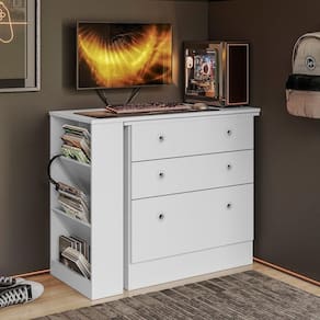 Durante o dia, funciona como uma escrivaninha ampla e confortável para estudos ou home office. À noite, transforma-se em uma cômoda espaçosa com três gavetas, oferecendo praticidade no armazenamento de roupas e objetos pessoais.