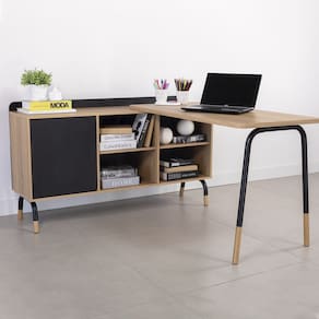 Mesa Escrivaninha Em L 28004, foi inspirada no design orgânico e estilo contemporâneo, transformando seu ambiente de trabalho em um lugar leve e confortável. Possui estrutura em MDP 25 mm e 15 mm, acabamento em pintura BP (fosco). Composta por mesa com amplo tampo com cantos arredondados, balcão com uma porta, dobradiças metálicas com amortecimento e uma gaveta interna com corrediças telescópicas, 2 nichos com prateleira removível, seus pés são em tubos de aço com acabamento em pintura epóxi fosco e as extremidades em madeira maciça de eucalipto com sapatas reguláveis. Peso suportado: 55 kg (20kg mesa, 35kg balcão). Possui ampla superfície para trabalho e estudos, tornando o espaço mais funcional e organizado. Este móvel chegará na sua casa separado em 2 volumes.