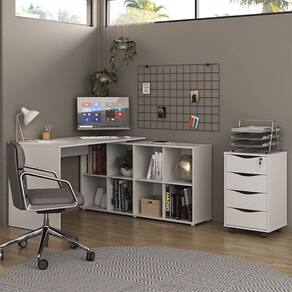 O conjunto de Mesa Escrivaninha em L Eron e Gaveteiro com Rodízios Mity A06 Branco , da Mpozenato, possui um design moderno sendo perfeito para o seu home office.