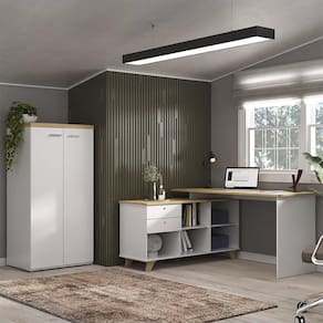 Conteúdo da Embalagem: 1 Mesa em L, 1 Armário Alto.