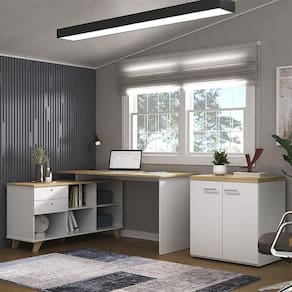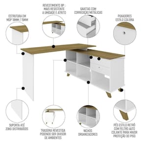 Com a Mesa Escrivaninha em L Golden e Balcão 2 Portas Tok A06 Olmo/Branco , da Mpozenato, a sua rotina no escritório ou home office será muito mais produtiva e agradável.
