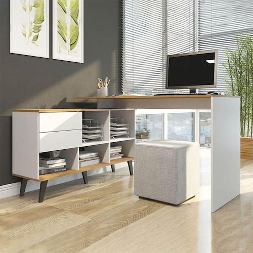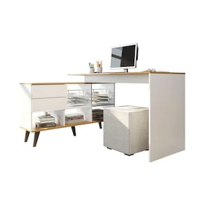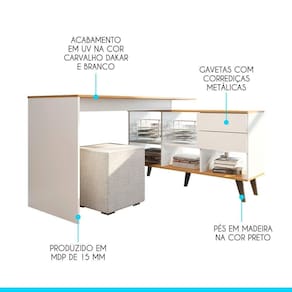 Mesa Escrivaninha Estante Nicho 2 Gavetas Mdp Menu Móveis Branco Carvalho A Mesa Escrivaninha e um movel util e versatil que promete ser o protagonista do seu ambiente. Dispoe de um design atual que facilita na hora de montar a decoracao, proporcionando um espaco mais aconchegante e organizado. Possui tampo espacoso, perfeito para o home office, alem de estante lateral com duas gavetas e nichos para armazenar seu material de uso diario. O destaque fica por conta dos pes retro, dando um toque unico ao movel. Alem de sua montagem que permite montar a estante nos dois lados, se adequando ao espaco disponivel. A mesa e produzida com materiais de excelente qualidade, garantindo a sua durabilidade. O melhor em moveis no design atual aliando conforto, qualidade e otimos precos, so na Menu Moveis! Caracteristicas: Referencia: 0747 Material: MDP de 15 mm Acabamento: Pintura UV na cor Branco e Carvalho Dakar Gavetas: 02 Gavetas com Corredica Metalica Puxadores tipo Cava Lateral Pes Retro em Madeira com 18 cm na cor Preto
