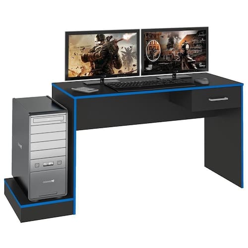 Escrivaninha gamer que oferece organização e estilo para quem busca um espaço funcional para jogar ou trabalhar. Produzida em MDP de 15 mm, conta com amplo tampo que suporta até 10 kg (acomoda até dois monitores), 1 gaveta equipada com corrediças metálicas e puxador plástico (tipo Java), suporte elevado lateral para gabinete, que suporta até 10 kg e inclui sapatas plásticas. Acabamento em pintura UV lisa acetinada e bordas coloridas. Este móvel chegará em sua casa separado em 01 volume.