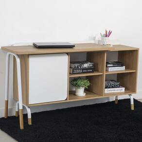 Mesa Escrivaninha Giratoria 28005, foi inspirada no design orgânico e estilo contemporâneo, transformando seu ambiente de trabalho em um lugar leve e confortável. Possui estrutura em MDP 25 mm, 15 mm e fundo HDF 3 mm, e acabamento em pintura BP (fosco). Composta por mesa giratória com amplo tampo com cantos arredondados, balcão com uma porta, dobradiças metálicas com amortecimento e uma gaveta interna com corrediças telescópicas, 2 nichos com prateleira removível, seus pés são em tubos de aço com acabamento em pintura epóxi fosco e as extremidades em madeira maciça de eucalipto com sapatas reguláveis. Peso suportado: 50kg (20kg mesa, 35kg balcão). Possui ampla superfície para trabalho e estudos, tornando o espaço mais funcional e organizado. Este móvel chegará na sua casa separado em 2 volumes.