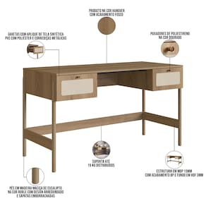 Os pés em madeira maciça oferecem robustez e durabilidade, enquanto o detalhe em tela sintética adiciona um elemento suave e sofisticado. O estilo minimalista da mesa expresso pelas linhas retas não só otimiza o espaço, mas também proporciona uma estética limpa e inspiradora, permitindo que você se concentre no que realmente importa: suas ideias. Ideal para quem busca um ambiente de trabalho que seja ao mesmo tempo funcional e acolhedor, essa mesa para escritório é o complemento perfeito para o seu home office.