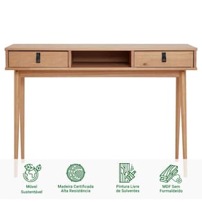 A Escrivaninha Kim é um móvel elegante e versátil, perfeita para o seu espaço de trabalho em casa. Sua superfície espaçosa oferece espaço suficiente para realizar tarefas e organizar materiais, pode também ser usada com notebook. Os pés cilíndricos conferem um estilo rustico/minimalista e elegante. Além disso, possui duas gavetas com puxadores em couro e com amplo espaço para manter seus itens organizados, e um nicho integrado para armazenar objetos de forma prática e adicionar personalidade ao móvel.