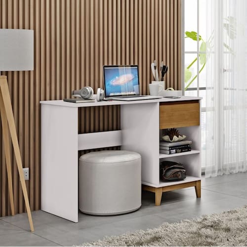Transforme qualquer ambiente em um refúgio de produtividade e bom gosto com a Escrivaninha 1 Gaveta, elegante e acolhedora, ela combina o charme da cor Freijó, criando uma peça versátil para se encaixar perfeitamente no quarto, home office ou cantinho de estudos Com design inteligente e prático, oferece uma gaveta discreta para guardar objetos pessoais e dois nichos abertos para manter livros, cadernos ou itens de decoração sempre à mão. Além disso, os pés altos e design exclusivos trazem leveza e sofisticação ao visual.<Br>