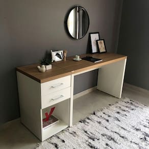Características da Mesa Escrivaninha para Escritório Loke: - Travessa em MDP 15mm de espessura com fita de borda PVC com 0,45mm de espessura; - Tampo e laterais em Tamburato 37mm de espessura com fita de borda PVC com 1mm de espessura; - Sapatas plásticas; - Não acompanha objetos decorativos; - Montagem por conta do comprador;