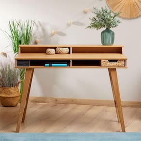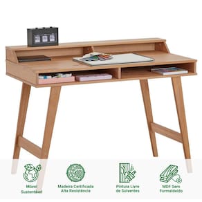 A mesa escrivaninha Luna de madeira maciça é um móvel deslumbrante, feita com madeira de alta qualidade. Essa mesa combina funcionalidade e beleza, proporcionando um espaço de trabalho elegante e organizado. Seu design oferece uma estética natural e acolhedora com pés cônicos realçando a beleza do móvel, adicionando também um toque de elegância rústica ao ambiente. Com espaço de trabalho generoso, essa escrivaninha permite que você realize suas tarefas de forma eficiente e organizada, possuindo dois nichos integrados e mais dois nichos inferiores perfeitos para manter seus pertences organizados e com fácil acesso.