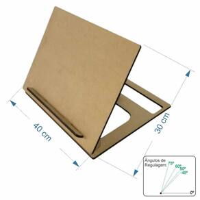 Mesa suporte inclinavel em mdf 6mm para estudos ou leitura. Fabricado atravéz de tecnologia digital de corte a laser, tem o tmanho ideal para diversas aplicações. Pratico e fácil, pode ser guardado em qualquer local tanto na horizontal como na vertical. Possui 5 níveis de regulagem de altura, se adequando a sua necessidade. Tamanho da área do suporte aproximado: 40x30x5cm Homologação Anatel: 005491303330 Marca: Não Informado