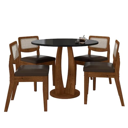 Detalhes Técnicos da Mesa -Acabamento:Pintura UV Texturizada -Material da Base:MDF -Material do Tampo:MDF -Medida da Mesa Montada:A:80CMxL:90CMxP:90CM -Tonalidade da Mesa:Freijó/Preto -NÃO POSSUÍ VIDRO