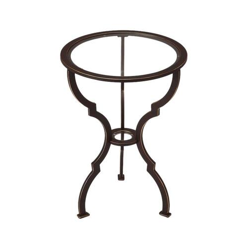 Base de uma ampulheta vai arabesco, mas mantém linhas simples e aberta. Vedação maca e manter este top de vidro redonda mesa final aberto e arejado. Durável ferro moldura em um acabamento preto.