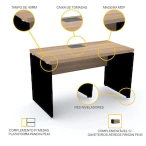 Elaborar a planta de um escritório unindo funcionalidade, beleza e bom gosto pode ser difícil. Porém, com móveis práticos e de boa qualidade, o desafio se transforma em uma tarefa fácil. Ao desenhar o projeto das mesas de seu ambiente corporativo, considere esta mesa modulável frontal da linha PE40 da Pandin, que é o móvel certo para ficar na ponta da sua plataforma de trabalho, já que foi confeccionado levando em consideração as medidas de duas mesas plataforma iniciais, juntamente ao painel divisor que as une (peças da mesma linha, vendidas separadamente). Com tampo na cor madeira natural e pés pretos, ela ainda conta com caixa Power Box para facilitar a instalação de aparelhos eletrônicos ou telefônicos, podendo servir como mesa base para impressora, telefone ou central de cabos. Esta mesa é uma peça com a qualidade da linha PE40 da marca Pandin, conhecida por seus móveis de escritório de design clássico e sofisticado que unem beleza, funcionalidade e estilo ao melhor custo-benefício do mercado.