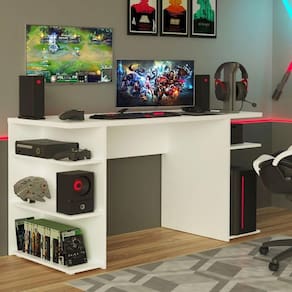 Não importa se você joga no ou no videogame, tem lugar pra organizar tudo. O tampo é reforçado e tem espaço para teclado, monitor, mouse, caixas de som e o que mais você preferir. Na parte inferior são várias prateleiras, perfeitas para CPU, jogos, controles e o console.