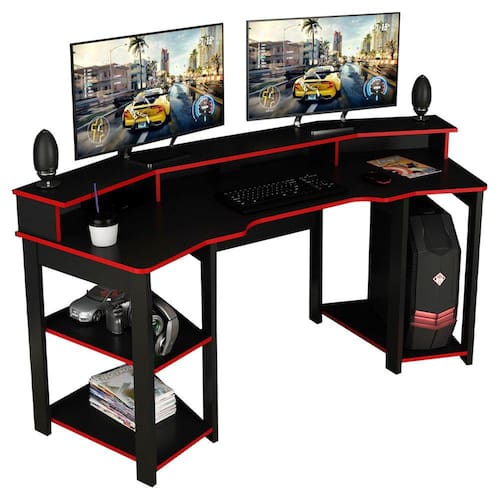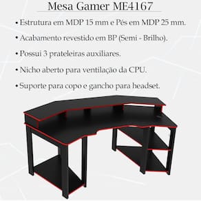 Mesa Gamer Cockpit 3 Prateleiras ME4167, é a opção perfeita para quem busca conforto e funcionalidade em seus momentos de lazer ou home office. Estrutura em MDP de 15mm, pés em MDP de 25mm proporcionando maior durabilidade e resistência a peça, possui usinagem anatômica no tampo para melhor conforto e desempenho, contando com acabamento revestido em BP (Semi - Brilho). Composta por 3 prateleiras com amplo espaço para armazenar diversos itens, nicho aberto para ventilação da CPU, suporte para copo, gancho para headset, e acompanha sapatas plásticas. Suportando 15kg tampo base, 5kg tampo superior e 10kg as prateleiras. Perfeita para deixar seu ambiente produtivo, belo e organizado, ideal para ser utilizada em home office, escritório ou um cantinho de estudos. Este móvel chegará na sua casa separado em 1 volume.