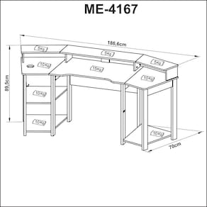 A Mesa Gamer Cockpit Para 2 Monitores ME4167 é produzida em MDP 15mm e acabamento BP. Possui 3 prateleiras que suportam até 10kgs cada. Possui suporte para copo e gancho para headset. Produto suporta até 80kgs. Conteúdo da embalagem: móvel, ferragens e manual de montagem. A fixação das peças e/ou acessórios é feita por parafusos, cavilhas e minifix. Para uma limpeza mais efetiva, utilizar apenas pano macio umedecido e sabão neutro. Não utilizar produtos abrasivos. Garantia de 03 meses contra defeitos de fabricação. Medidas do produto (AxLxP): 89,5x186,6x70cm. Peso do produto: 32kgs.