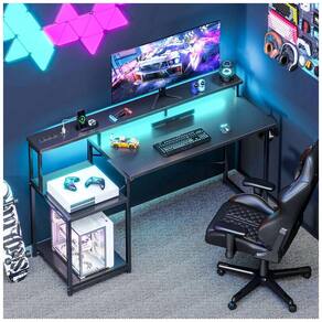 A estrutura de metal espesso de alta qualidade garante estabilidade e durabilidade. A mesa também conta com uma prateleira completa para monitor, proporcionando amplo espaço de armazenamento e um ângulo de visão confortável. A prateleira é reversível e ajustável, podendo ser instalada à esquerda ou à direita conforme sua preferência, e pode ser ajustada em duas alturas diferentes. Além disso, você pode usar a prateleira superior para uma impressora grande ou um scanner, e o gancho para fones de ouvido instalado no lado oposto da mesa mantém seus acessórios organizados e acessíveis.