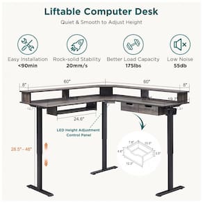 A Mesa em L Elétrica RedLemon de 60 polegadas (152 cm) em acabamento carvalho rústico escuro utiliza mecanismo de elevação elétrica com ajuste de altura de 71 cm a 117 cm e 4 posições memorizáveis via painel touch para configurações rápidas. Estrutura em aço inoxidável com tampo de madeira de carvalho de 2,5 cm de espessura integra prateleira para monitor, duas gavetas tipo caixa com corrediças de madeira, bandeja retrátil para teclado, ganchos laterais, suporte giratório 360° para copo e tomadas elétricas com portas USB para carregamento de laptops e smartphones.