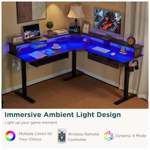 Luzes LED RGB oferecem 12 modos de cena com ciclos de cores configuráveis, controladas independentemente para setups gamer ou estações de trabalho. Design em formato L de 152 cm x 152 cm com diagonal de superfície de 214 cm otimiza divisão em áreas de escritório e entretenimento, com montagem autônoma no piso e limpeza por pano seco. Acabamento tingido para maior durabilidade em ambientes de uso intensivo como salas, escritórios ou estudos.