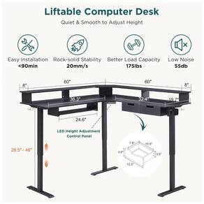 A Mesa em L Elétrica RedLemon de 60 polegadas (152 cm) em acabamento fibra de carbono preta possui mecanismo de elevação elétrica com ajuste de altura de 71 cm a 117 cm e 4 memórias pré-programadas para seleção rápida via controle touch. Estrutura metálica com tampo de madeira engenheirada de 2,5 cm de espessura integra prateleira para monitor, duas gavetas tipo caixa com corrediças suaves, bandeja retrátil para teclado, ganchos laterais, suporte giratório 360° para copo e tomadas elétricas com portas USB para carregamento simultâneo de múltiplos dispositivos.