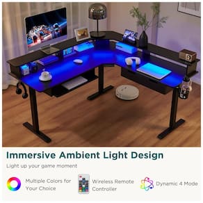 Luzes LED RGB com 12 modos de cena oferecem ciclos de cores configuráveis, ideais para setups gamer ou estações de trabalho com iluminação ambiente personalizada. Design em formato L de 152 cm x 152 cm com diagonal de superfície de 206 cm permite divisão funcional em áreas de escritório e entretenimento, com montagem no tampo e limpeza simples por pano seco. Acabamento pintado para maior resistência em ambientes de uso intensivo como salas de estar, escritórios ou estudos.