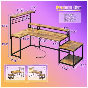 A Mesa Gamer em L EnHomee de 160 cm apresenta layout reversível para instalação em canto esquerdo ou direito, com dimensões de 160 cm de largura por 80 cm de profundidade e altura máxima de 135 cm, adequada para setups gamer ou estações de trabalho em espaços compactos como quartos de jogos ou salas de estudo. Construída com tampo de madeira de 2,5 cm de espessura em acabamento marrom rústico pintado e base metálica fosca, inclui prateleira superior para exibição, grade lateral para armazenamento adicional e suporte lateral para impressora ou torre de PC.