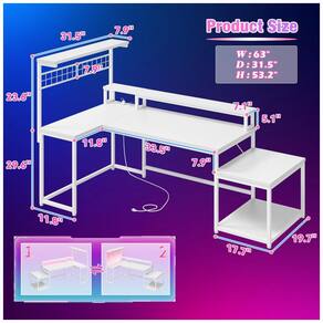 A Mesa Gamer em L EnHomee de 63 polegadas oferece layout reversível configurável para canto esquerdo ou direito, com dimensões de 160 cm de largura por 80 cm de profundidade e altura máxima de 135 cm, ideal para setups gamer ou estações de trabalho em espaços compactos como quartos ou salas de estudo. Construída com tampo de madeira em acabamento pintado branco e base em madeira fosca, inclui prateleira superior para exibição, grade lateral para armazenamento extra e suporte lateral para impressora ou torre de PC.