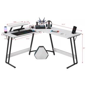 A diagonal de superfície de trabalho alcança 136 cm, suportando operação simultânea de dispositivos gamer. Acabamento brilhante em branco clássico cobre tampo e base, compatível com limpeza por pano seco em ambientes residenciais. Montagem requerida para uso em escritórios ou salas de jogos.