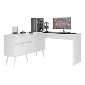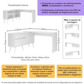 Diferenciais: - 3 anos de garantia contra defeitos de fabricação e material. - Estrutura em madeira proveniente de reflorestamento (MDP 15mm): mais resistência e durabilidade para o uso intenso do dia a dia. - Acabamento acetinado (20% de brilho): visual moderno e facilidade na limpeza. - 4 opções de montagem: formato reto ou em L (canto), com a mesa à esquerda ou à direita do balcão. - Tampo amplo: espaço ideal para colocar seu computador e acessórios. - 2 portas e 1 gaveta com corrediças metálicas: deslizamento suave e organização prática para manter tudo no lugar. - Puxador em ABS: resistente e funcional no uso diário. - Pés em polipropileno no estilo retrô: proporcionam estabilidade e um toque vintage.
