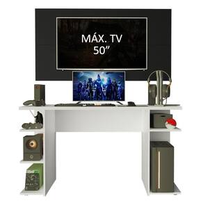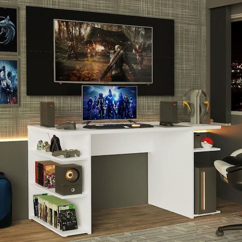 A mesa comporta perfeitamente monitor, teclado, mouse, controle, caixas de som, e o que mais você preferir. Possui também diversas prateleiras, perfeitas para CPU, console, jogos e outros objetos decorativos. Além disso, pode ser utilizada como escrivaninha para trabalho ou estudo.