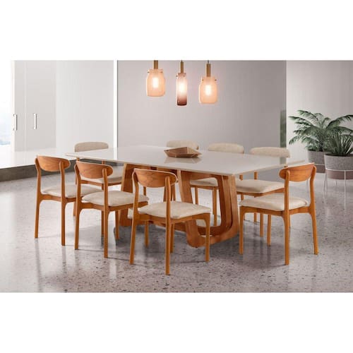 Mesa de lâmina de madeira cinamomo, com tampo canto moeda laqueado off white e vidro serigrafado off white temperado. Cadeira de madeira maciça tauari, com assento em espuma D26 revestido em tecido veludo e encosto em espuma D18 revestido em tecido veludo. Medida da Mesa (A x L x P): 80 x 220 x 110 Peso da Mesa: 101,26 kg Mesa suporta até: 80 kg Acabamento da Cadeira/Banco: Pintura Acabamento da Mesa: Verniz Acompanha Manual de Instalação: Não Almofada do assento: Fixa Altura do Conjunto: 86 cm Ambiente Principal: Sala de Jantar Cadeira/Banco estofada: Encosto e Assento Estofados Cadeira/Banco suporta até: 120 kg Complexidade da Montagem: Média: pode ser montado por mais de uma pessoa e/ou necessite de maior conhecimento para montagem Cor: Cinamomo imbuia/Laq. Off white - Imbuia natural Cor da Base: Marrom Cor do Produto: Cinamomo Imbuia/Laq. Off White - Imbuia Natural Cor do Tampo: Off White Cor Flex: Não Cor Secundária: Branco De Canto (Canto Alemão): Não Design da Base: Em H Enchimento do Assento: Espuma D-26 Enchimento do Encosto: Espuma D-18 Escala de Brilho: Fosco Espessura do Tampo: 40 mm Espessura do Vidro: mm Estrutura do Assento: Madeira maciça tauari. 30mm Estrutura do Encosto: Madeira maciça tauari. 30mm Formato do Tampo: Retangular Informações Complementares: Conjunto com um designer super moderno com muita qualidade e conforto Itens Inclusos: 1 Mesa com 8 Cadeiras Linha ou Coleção: Genova com Monaco Manual de Montagem e Instalação: https://product-hub-prd.madeiramadeira.com.br/898059/documents/44a67677-0ece-4cf9-9098-26f0a3fbf16a0627522821manualdemontagem.pdf Material da Base da Mesa: Madeira Maciça Material da Estrutura da Cadeira: Madeira Maciça Material do Tampo: Madeira Maciça Material Principal: Madeira Maciça/Vidro Material Principal das Cadeiras/Bancos: Madeira Maciça Medida da Base (A x L x P): 78 x 55 x 158 Medida da Cadeira/Banco (A x L x P): 86 x 48 x 53 Medida do Canto Alemão (A x L x P): Não Possui Medida do Tampo (L x C x E): 220 x 110 x 4 Mesa Dobrável: Não Mesa Extensível: Não Montagem Flex: Não Necessita Montagem: Sim Origem do Produto: Nacional Peso da Cadeira/Banco: 6,7 kg Possui Apoio para Braços: Não Possui Apoio Para os Pés: Não Possui Prateleiras: Não Possui Rodízio: Não Possui Suporte Giratório: Não Possui Vidro: Sim Quantidade de Cadeiras: 8 Quantidade de Lugares: 08 Recomendações de Uso, Manutenção e Limpeza: Limpar com pano seco Revestimento da Cadeira/Banco: Veludo Sistema de Montagem: Parafusos Tipo de Assento: Fixo Tipo de Encosto: Fixo Tipo de Madeira Maciça da Base da Mesa: Tauari Tipo de Madeira Maciça do Tampo: Tauari
