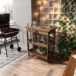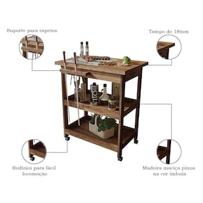 Para facilitar aquele churrasco com a família e amigos, desenvolvemos a Mesa Gourmet Carrinho de Churrasco W01 Tampo com Cerâmica Madeira Maciça Imbuia Clique Chique. Pois é um produto que vai te auxiliar na hora do seu churrasco, pois possui amplo espaço para armazenamento de acessórios ou condimentos em suas prateleiras, suporte de espeto, suporte para talheres grandes e rodízios para facilitar sua locomoção. A Mesa Gourmet Carrinho de Churrasco possui cerâmica com tema vintage em seu tampo e sua estrutura é feita em madeira maciça Pinus na cor imbuia, um produto que mescla beleza com resistência.