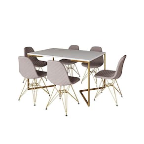 Mesa Industrial Retangular Branca Base V Dourada 137x90cm 6 Cadeiras Estofadas Nude Médio Dourada - Branco