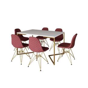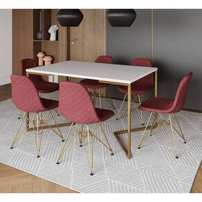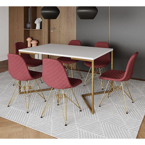 A mesa de jantar é um dos poucos móveis que efetivamente reúne a família para saborear um bom prato ao lado das pessoas que mais ama. E para garantir que o seu ambiente fique impecável, conte com a Mesa De Jantar Industrial. As laterais vazadas, sua forma reta e sua base em V conferem sofisticação e ótimo aproveitamento no cômodo.Tipo: ConjuntoModelo: Industrial Base VCor Tampo Mesa: BrancoCor Base Mesa: DouradoCor Assento Cadeira: VermelhoCor Base Cadeira: DouradoMedidas da Mesa:Altura: 78cmComprimento: 90cmLargura: 137cmMedidas da Cadeira:Altura: 85cmLargura: 47cmComprimento: 37cmATENÇÃOIMAGENS MERAMENTE ILUSTRATIVAS REALIZADO EDIÇÃO, PODENDO HAVER UMA PEQUENA VARIAÇÃO DE COR DEPENDENDO DE CADA TELA OU MONITOR.