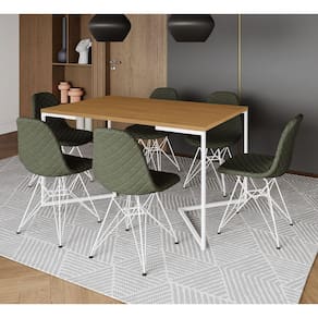 A mesa de jantar é um dos poucos móveis que efetivamente reúne a família para saborear um bom prato ao lado das pessoas que mais ama. E para garantir que o seu ambiente fique impecável, conte com a Mesa De Jantar Industrial. As laterais vazadas, sua forma reta e sua base em V conferem sofisticação e ótimo aproveitamento no cômodo.Tipo: ConjuntoModelo: Industrial Base VCor Tampo Mesa: Canela Cor Base Mesa: BrancoCor Assento Cadeira: Verde Cor base Cadeira: Branco Medidas da Mesa:Altura: 78cmComprimento: 90cmLargura: 137cmMedidas da Cadeira:Altura: 85cmLargura: 47cmComprimento: 37cmATENÇÃOIMAGENS MERAMENTE ILUSTRATIVAS REALIZADO EDIÇÃO, PODENDO HAVER UMA PEQUENA VARIAÇÃO DE COR DEPENDENDO DE CADA TELA OU MONITOR.
