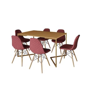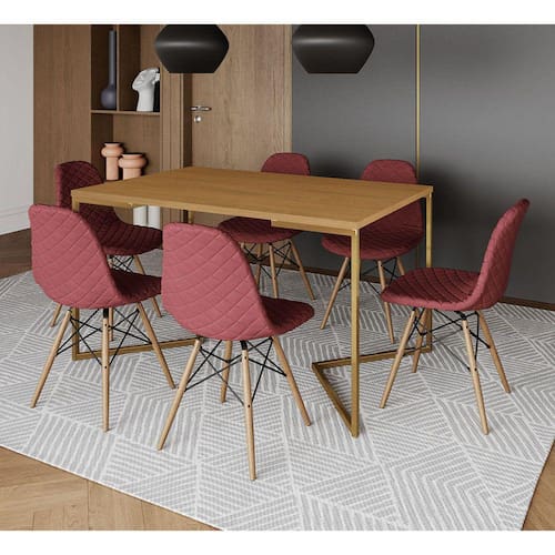 Mesa Industrial Retangular Canela Base V Dourada 137x90cm C/ 6 Cadeiras Madeira Estofadas Vermelhas - Marrom