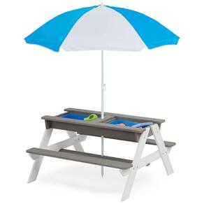 É uma mesa multifuncional projetada para crianças brincarem com areia e água. Além disso, pode ser convertida em uma mesa de piquenique cobrindo os tampos planos da mesa. A mesa tem 2 caixas no tampo para brincar com areia e água, 2 bancos embutidos para acomodar até 4 crianças e guarda chuva ajustável removível para proteger do sol ou da chuva durante as brincadeiras ao ar livre. É uma ótima ideia de presente para crianças que gostam de brincar no quintal, pátio, jardim ou alpendre. A montagem é rápida e fácil, seguindo o livro manual para instalar. A mesa é feita de madeira de cicuta sólida natural bem selecionada, resistente e durável, com acabamento suave de tinta à base de água.