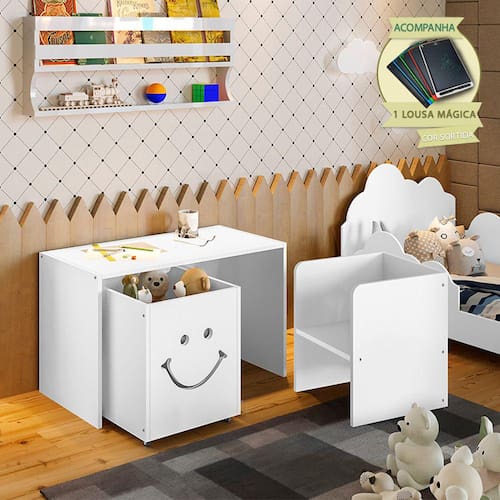 A Mesa Infantil Alegra Smile com cadeira e nicho é a escolha ideal para montar um cantinho de brincar prático e divertido no quarto do seu pequeno. Um móvel perfeito para quartos montessoriano e brinquedotecas.Tipo: Conjunto Mesa, Cadeira e NichoModelo: AlegraCor: BrancoGarantia: 90 diasProduto DesmontadoMaterial 100% MDFPintura UV Verniz BrilhoAcompanha lousa mágica (Produto Ecológico, Salva 3 Árvores, para o Desenvolvimento, Botão para Limpar, Bateria Média 2 Anos)1 Mesa1 Cadeira1 NichoNicho acompanha rodízios (rodinhas)Objetos não acompanham o produtoMedidas MesaAltura: 50cmLargura: 80cmComprimento: 40cmMedidas Nicho e CadeiraAltura: 43cmLargura: 38cmComprimento: 38cmATENÇÃOIMAGENS MERAMENTE ILUSTRATIVAS REALIZADO EDIÇÃO, PODENDO HAVER UMA PEQUENA VARIAÇÃO DE COR DEPENDENDO DE CADA TELA OU MONITOR. Marca: BABY MOBILIA