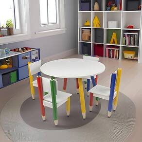 Mesa Infantil Lápis Coloridos Redonda Tampo Branco Pés Temáticos Quarto Menina Menino Mobília Decor Mesinha Redonda Infantil Pé Lápis Mesa redonda para quartos infantis, brinquedotecas e escolinhas, com tampo 80x80 cm e pés em formato de lápis coloridos (amarelo, verde, vermelho e azul), unindo diversão e praticidade no dia a dia.? Medidas e capacidade: 56 cm de altura; 80 x 80 cm; peso 6,2 kg; suporta até 10 kg distribuídos.?