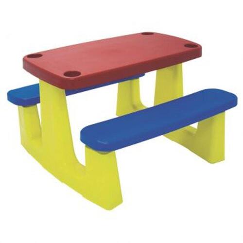 O modelo conta com uma mesa e dois bancos em conjunto único fabricado em polipropileno, com a qualidade do material 100% virgem, resistente e durável. O tampo da mesa conta com o diferencial de 4 compartimentos nas extremidades, para apoiar copos, garrafas e os mais diversos materiais como canetas e lápis. Com acabamento em pintura ultravioleta nas cores verde e rosa, o produto atende às dimensões de 52 cm de altura, 82 cm de largura e 90 cm de comprimento. O modelo ainda conta com aplicação de anti-UV, tornando-o ainda mais resistente ao desgaste provocado pela exposição a raios solares.